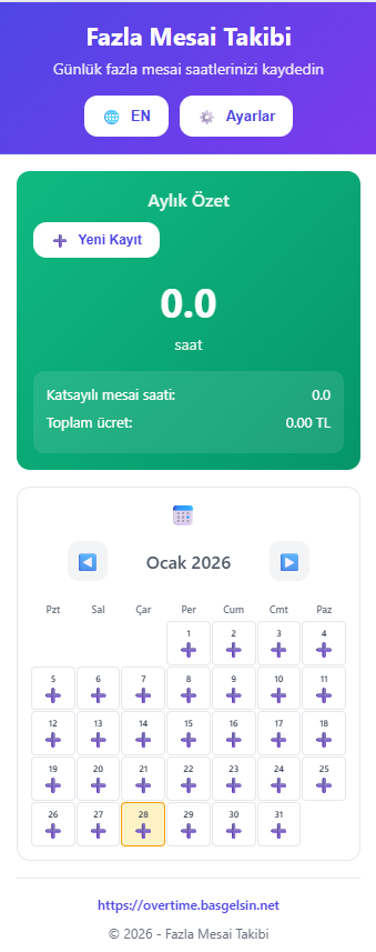 Fazla Mesai Takibi tamamen ücretsizdir. Herhangi bir kayıt gerektirmez.
