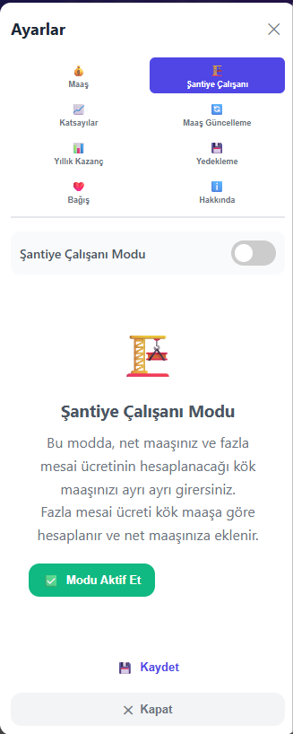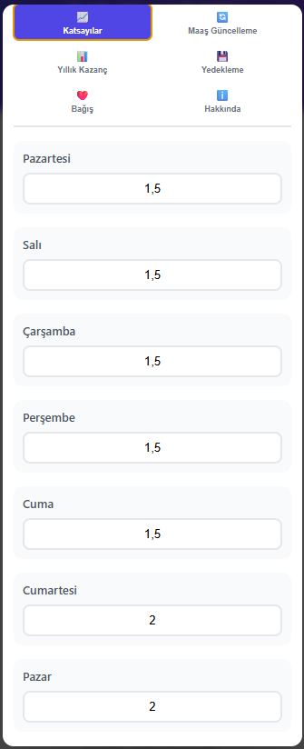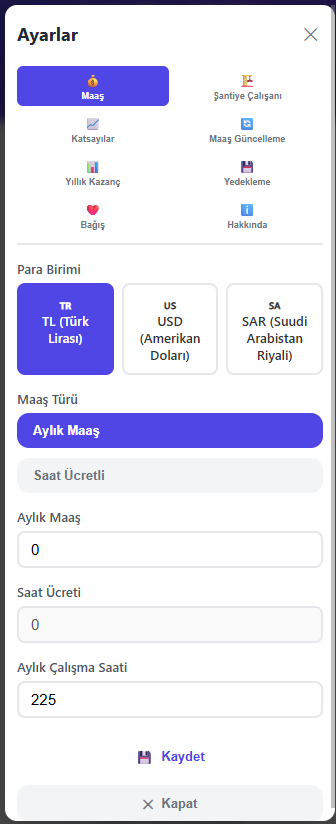 Maaş türünüzü (aylık veya saat ücretli), çalışma saatlerinizi ve fazla mesai katsayılarınızı belirleyin.